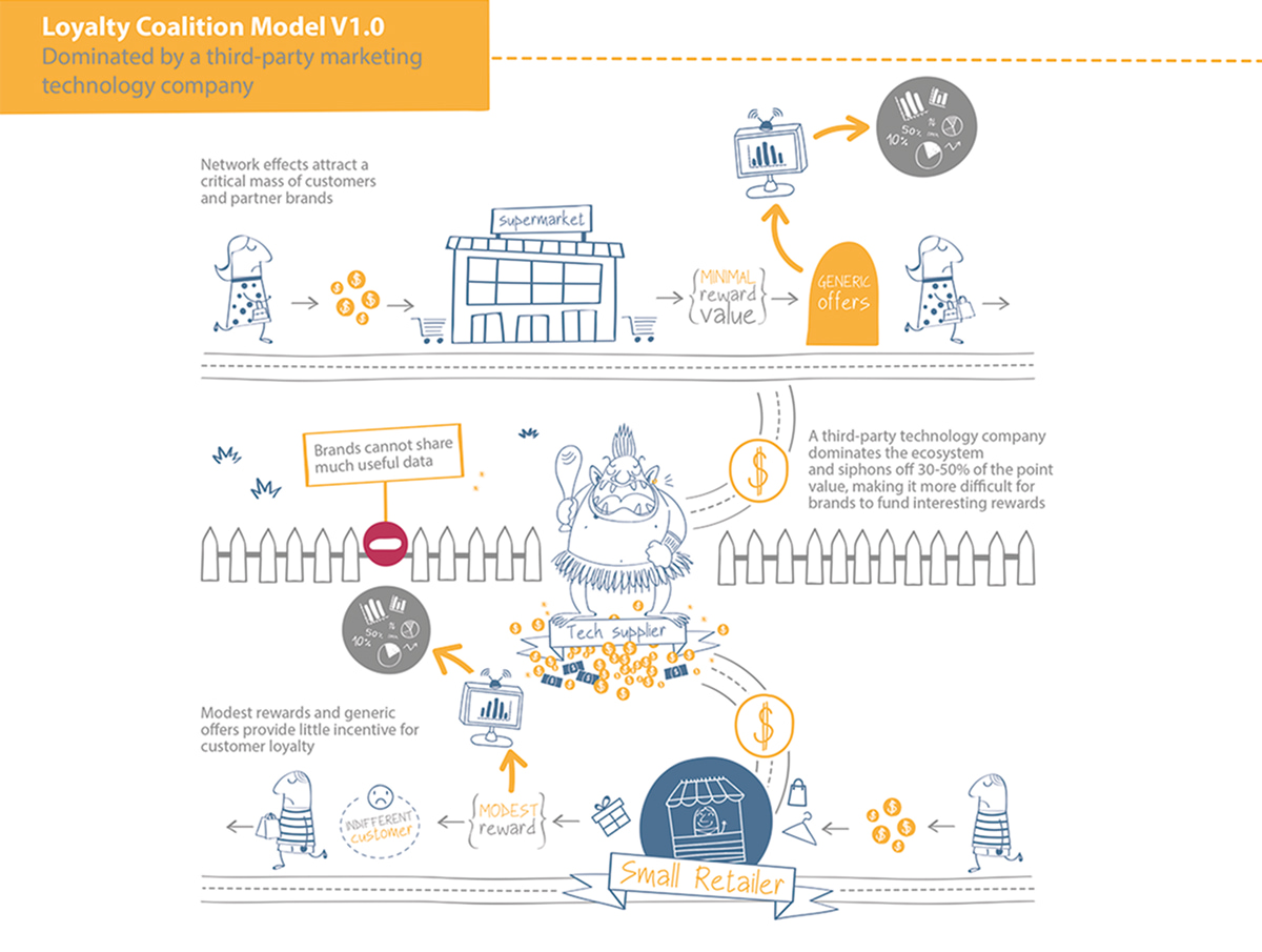 This initially took place via the earliest loyalty coalitions, in which a third-party marketing company owned the technology and dominated the ecosystem. Air Miles was the first and best-known example.